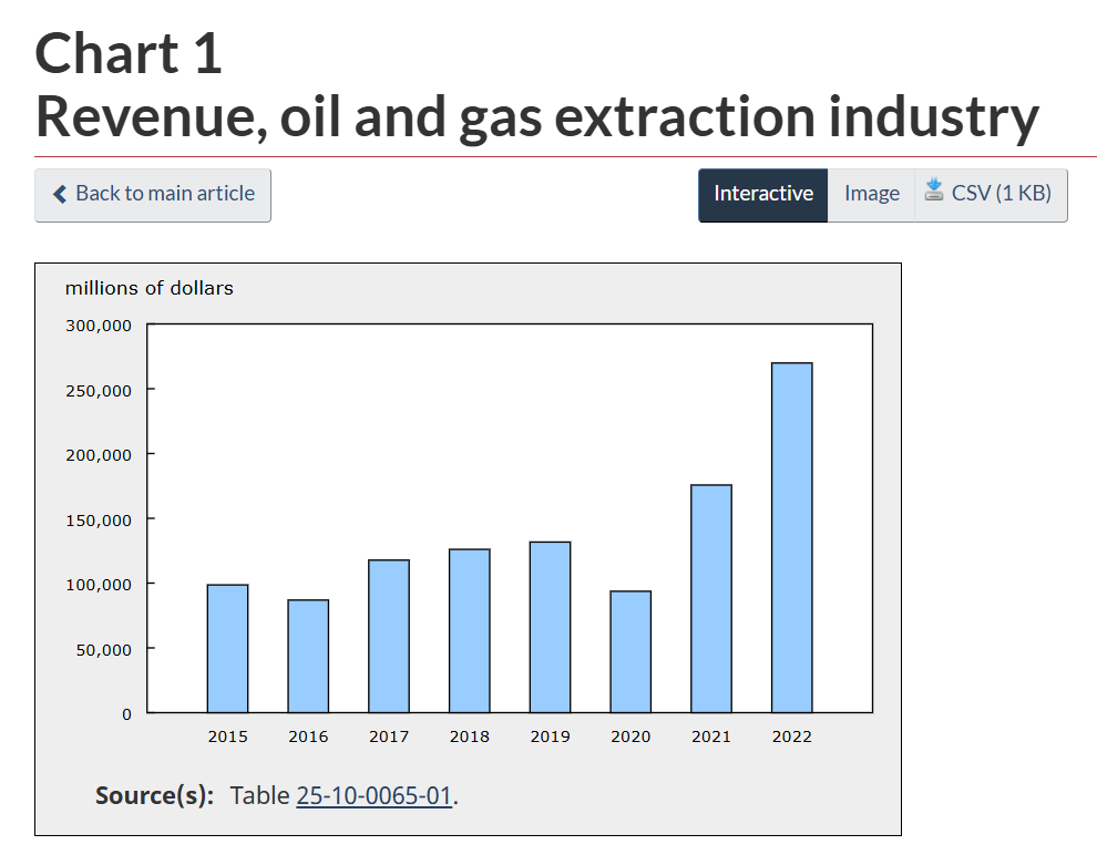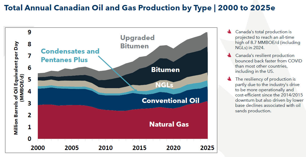 This is seen in total production levels, increasing with no sign of slowing (source: https://www.capp.ca/wp-content/uploads/2023/12/The-Economic-Impact-of-Canadian-Oil-and-Gas.pdf):