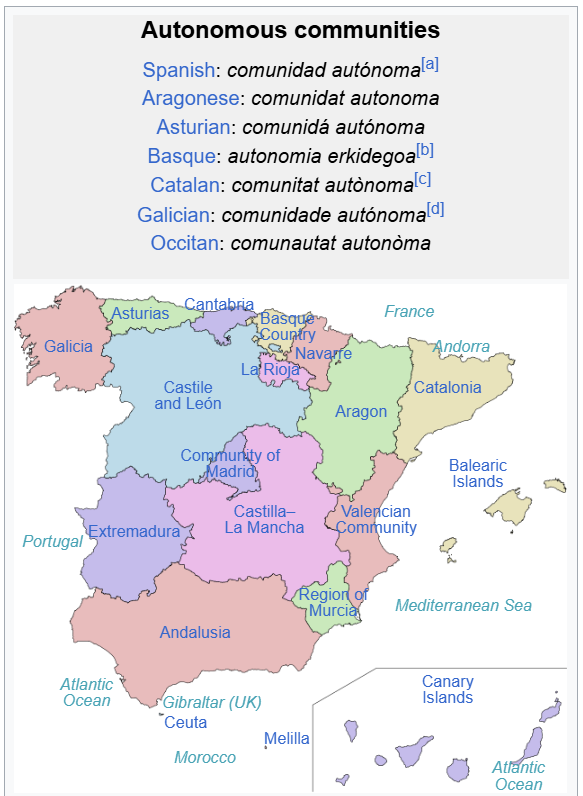 As I noted in the opening, countries globally have experiences of separatist groups and these frequently relate to: 1) Historical conflicts and imperialist actions of nations states; 2) Unique needs of unique cultural/religious/language groups; 3) Ethnic cleansing/genocide; 4) Full democratic rights not granted to all persons; and 5) Political responses to dictatorships. I'm sure political scientists and historians could build out this list quite a bit, but I offer it as it highlights the importance of understanding and listening to many separatist groups. Spain offers an example with many autonomous regions existing to allow for a nation across significant diversity and historical conflict (source: https://en.wikipedia.org/wiki/Autonomous_communities_of_Spain):